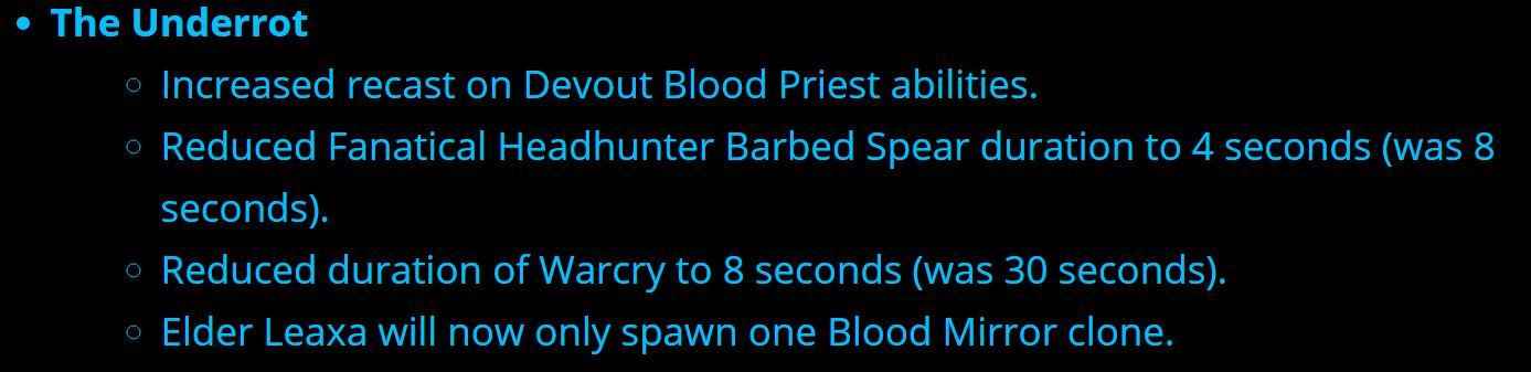 地渊孢林 提高虔诚鲜血祭司技能的再次施法时间。 p 减少狂热猎头者的带钩长矛的持续时间到4秒(原为8秒)。 p 减少战吼的持续时间到8秒(原为30秒)。 p 长者莉娅克萨只召唤一个血之镜像。 p