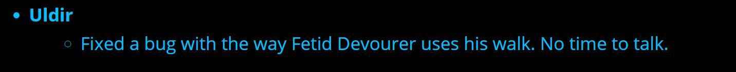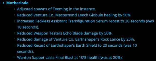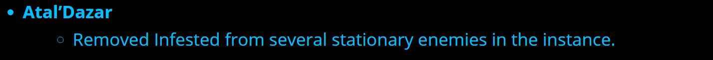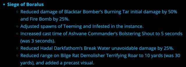 围攻伯拉勒斯 减少黑油投弹者燃烧沥青50%的初始伤害,降低火焰炸弹25%的伤害。 p 调整副本中的繁盛和共生怪物。 p 增加艾什凡指挥官的强化怒吼的施法时间到5秒(原为3秒)。 p 减少哈达尔·黑渊的激流破奔25%的不可避免伤害。 p 降低水鼠帮歼灭者恐惧咆哮的射程到10码(原为30码),并增加预施法效果。 p
