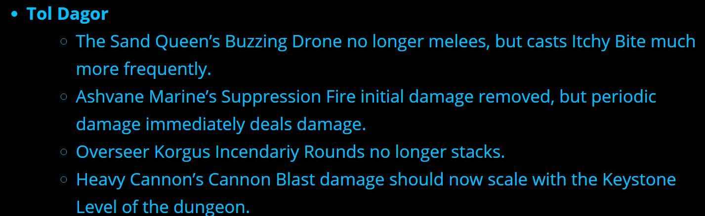 托尔达戈 泥沙女王嗡鸣的寄生虫不攻击近战,但会更频繁地施放瘙痒叮咬。 p 艾什凡水兵的火力压制初始伤害被移除,但持续伤害变成立即造成伤害。 p 科古斯狱长的爆炎弹不叠加。 p 重型火炮的火炮冲击伤害更大秘境的层数相关。 p