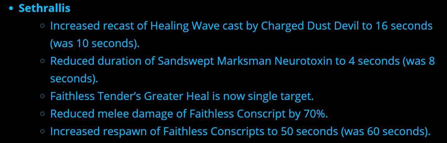 塞塔里斯神庙 延长充能的沙尘恶魔的治疗波再次施放时间延到16秒(原为10秒)。 p 减少卷沙神射手的神经毒素的持续时间到4秒(原为8秒)。 p 无信护卵员的强效治疗药水变单体法术。 p 降低无信援兵的近战70%的伤害。 p 减少无信援兵的刷新时间到50秒(原为60秒)。 p