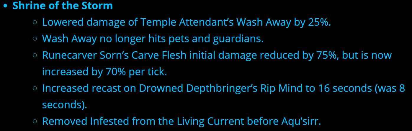 风暴神殿 降低神殿侍从冲刷25%的伤害。 p 冲刷对宠物和守护者无效。 p 刻符者食客的割肉的初始伤害降低75%,但提高每一跳70%的伤害。 p 增加溺水深渊使者撕裂大脑的再次施放时间到16秒(原为8秒)。 p 移除了阿库希尔前活体激流的共生。 p