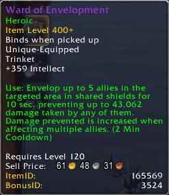 使用:为目标恢复49840点生命值,但会对你自己施加诅咒,吸收你接下来受到的16613点治疗。(2分钟冷却) 掉落:拉斯塔哈大王 评价:C+(raid)/B+(M+) 特效详解 治疗量受全能加成,可以爆击,但诅咒给自己的吸收盾是一个定值,不受副属性影响。 可以对自己施放,治疗会先于吸收盾生效。 诅咒buff持续5分钟,几乎不太可能等到buff自然消失。但16k的吸收盾并不高,会被自疗、吸血和各种aoe环境治疗自然刷满。不用太过担心。 从数字上看,使用特效能够提供约5w的单次有效治疗(比一颗糖略高),2分钟cd,也即约为412HPS。如果你的总体HPS为2.5w,那么该饰品的收益就约为1.6%。 大秘境中这一饰品的用处会多一些,因为你没有其他治疗的帮忙。如果你需要一个手段来刷吐金和荨麻,那它会是一个不错的选择。当然这放弃了一部分dps。 结论 应急潜力和实际的治疗输出确实很难平衡。但即便我们忽略诅咒部分,一个长cd却只能刷30%血的饰品表现也不会太好,整体价值并不高。 如果暴雪把治疗和诅咒的量同时增加,将会让选择更加有趣。 译者注:机制并不令人兴奋,仅仅是一个自杀光/暗影愈合而已。并且2分钟的CD实在是太长了,解决不了任何问题。如果1分钟cd的话,灵活性上还是有价值的。 [密闭结界]