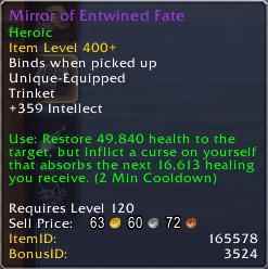 你附近5码内没有盟友时,每2秒你的爆击将提高27。当该效果叠加至10层时,你的精通也将提高84。 若你附近存在盟友,此效果会慢慢减退,除非此盟友也装备了此物品。 掉落:丰灵 评价:~A 特效详解 不用进战斗也可以叠层。所以你应该每次都能以10层开始战斗。 该饰品每2秒判定一次叠加与否,所以有时你能够穿过一个未佩戴的盟友而不损失层数。 无论你站在1人还是19人旁边,你都会以同样的速度损失层数。宠物和召唤物当然是不算的。 不应该指望其他队友装备这一饰品。在需要集合的场合,甚至无法保证每人都有。 理论上,如果你可以一个人全程站在角落远离所有人,这个饰品特效就价值全程的270爆击和84精通。这显然是最好的情况,因为这一属性总量远远超过了同装等的属性饰品的期望。 事实上,只要能够保证10层buff的覆盖率高于20%,就已经比同装等的触发属性类饰品要强了。在大多数战斗中这并不难。 大秘境里没有多少强制限制叠层的因素,所以耀辉裂片在大秘境中会很强,但会直接取决于你的队伍配置以及玩法。如果你需要一直变猫在近战群中输出,和他们保持分散5码几乎是不可能的。 结论 非常强的饰品,潜力很大。但表现取决于战斗本身,在raid开放之前很难给出准确的评价。但总之很强就是了! 译者注:耀辉裂片同样是几乎所有远程法系dps的毕业饰品。随着饰品的普及,远程带的人会越来越多。效果也会越来越好。 [纠缠命运之镜]