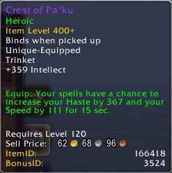 你的法术有几率使你的急速提高367,加速提高111。持续15秒。 掉落:神选者教团 评价:B- 特效详解 如果你是部落,你可以使用它来到达最近的帕库图腾。 平均每分钟触发1.5次,等于常驻138点急速。这离基准的触发属性类饰品标准还差的很远。也许暴雪把触发的加速算到了装等里吧。 加速几乎毫无用处。 结论 我能理解暴雪设计了不止一个属性类饰品,这至少能避免过于垃圾的特效类饰品的出现(疫苗提取物x2)。然而触发加速并不能让它变得更有趣。 帕库冠羽在发布前至少需要一次数值上的buff,或者是干脆把加速的数值增加3倍并变成可使用,这样至少我们还有的可玩。 译者注:没有什么好说的,唯一的问题就是数值太低了。buff个30%-50%还能用,不buff就只能坐冷板凳,只比疫苗提取物这种躺枪无数的垃圾要好一点。 魔兽世界社区所有攻略资讯查询方法:1、想要寻找魔兽世界正式服和怀旧服最新攻略、资讯,可以下载安装魔兽世界社区。 2、首先点击下载魔兽世界社区,安卓下载地址:点击查看,IOS下载地址:点击查看,或者直接下载3dmapp,下载地址:点击查看。 3、下载安装app,然后点击app上方搜索关键词,会有相关下拉搜索,选择自己想要的魔兽世界攻略或者资讯,可以点击查看。