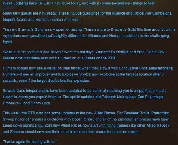 今天,《魔兽世界》官方发布了一条蓝贴,为最新PTR版本的开发者说明。设计师表示最新的PTR补丁已上线,多项内容开放测试。