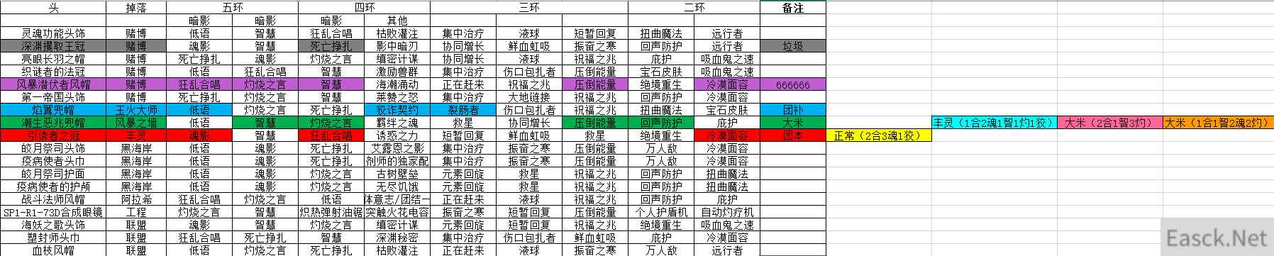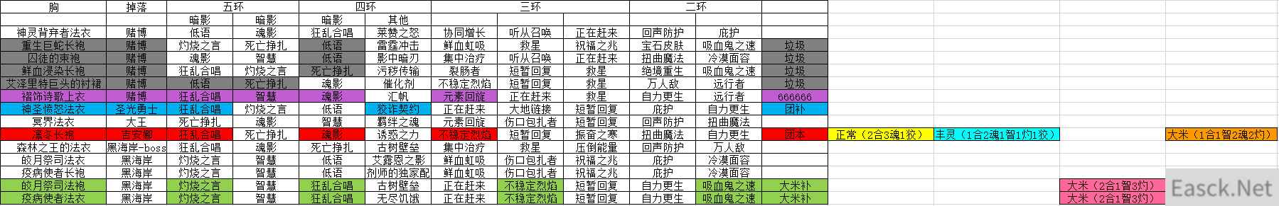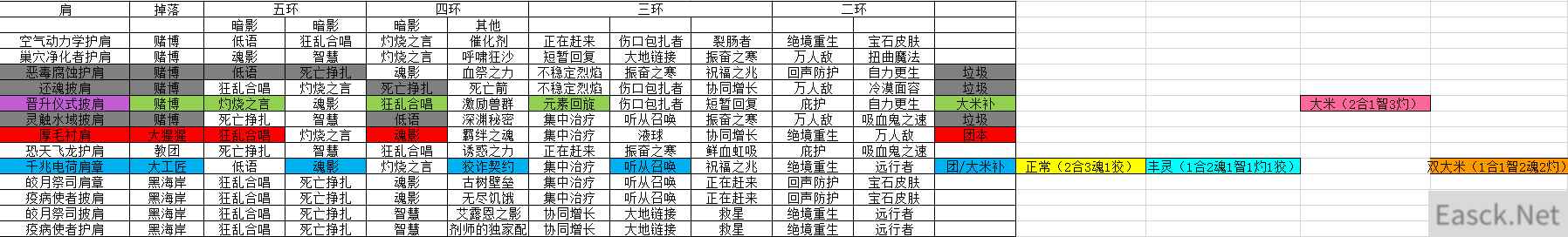 点击图片查看大图 简单食用指南 紫色标注:赌博最优特质(五环、四环、三环、二环特质都是高分) 红色标注:团本掉落,同时团本优质特质较多(并且尽量考虑大米可以通用) 深绿色标注:团本掉落,大米最优特质 浅绿色标注:大米补充特质 灰色标注:赌博出来的垃圾特质 大工匠的肩膀需要两件。避免洗特质的麻烦。 大米特质:魂影和灼烧 团本特质:魂影和狡诈 魔兽世界社区所有攻略资讯查询方法:1、想要寻找魔兽世界正式服和怀旧服最新攻略、资讯,可以下载安装魔兽世界社区。 2、首先点击下载魔兽世界社区,安卓下载地址:点击查看,IOS下载地址:点击查看,或者直接下载3dmapp,下载地址:点击查看。 3、下载安装app,然后点击app上方搜索关键词,会有相关下拉搜索,选择自己想要的魔兽世界攻略或者资讯,可以点击查看。