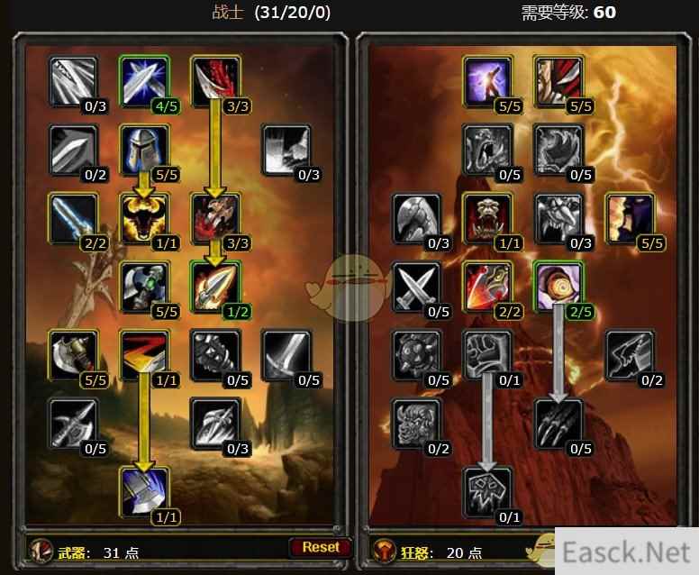 3撕裂→2招架→5战术→1愤怒→2压制→2招架→5双手武器→1横扫。5斧专→3重伤→1穿刺→1致死。此时40级,41级开始点狂暴天赋。5残忍→5震耳→1刺耳→4强化怒吼。2斩杀→1强化怒吼→2狂怒。至此60级,如果不转RAID坦克,此天赋通行战场、副本、野外。 魔兽世界14天游戏时间免费领取地址:点击查看