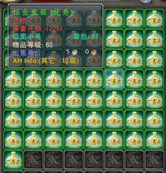 57个宝箱。 实测宝箱掉落为0.25%(甚至更低,有时候800只一个都不掉)稳妥起见就算保底23000只 (恒金宝箱只有61级以上精英怪掉落)