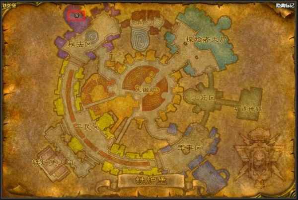 2、铁炉堡传送门训练师位于,铁炉堡中秘法区的位置,如上图之中所示,具体坐标为25.5,7.1,名字叫贝尔斯塔弗·风暴之眼传送门训练师。