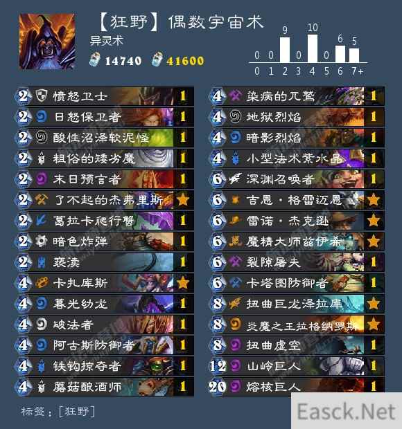 AAEBAf0GHr8U2LsCtgfurAPxrAONCPIF+waKB/sF4Qf2ApMB2wbcCs30Aq0Q58sCwxbx0AL90AKI0gLY5QKKAcCPA/yjA/+kA4GlA6GhA+TCAgAA 异灵术老师这几天直播时玩的一套偶数宇宙术,在欧服传说分段快乐划水。 偶数术的强势之处在于1费的英雄技能能让你比对手拥有更多的资源,而术士的优质偶数费用卡又非常多,除了亵渎地狱烈焰的强势解场,还有暮光幼龙、山岭、熔核巨人等优质的站场,新卡深渊召唤者和扭曲巨龙泽拉库也非常契合偶数术思路。由于偶数术的可选卡很多,再加上姐夫卡扎库斯和雷诺都是偶数费用,选择将宇宙体系加入到偶数术便成为了一种不错的选择。 上个版本的偶数术在获得染病的兀鹫和裂隙屠夫时已初露锋芒,只可惜生不逢时,众多直伤高爆发的奥秘法让前期需要大量卖血的偶数术难以生存。这版本的奥秘法没有获得补强,数量减少了不少,因此偶数术有了更大的发挥空间。 此外,偶数术的卡位灵活,一些单卡可以依据自己的环境来更换。小软和螃蟹多用于克制海盗战,而锁晶相当于偶数版洛欧塞布,在打机克术和有任务的法师时发挥出色。 ——苏打