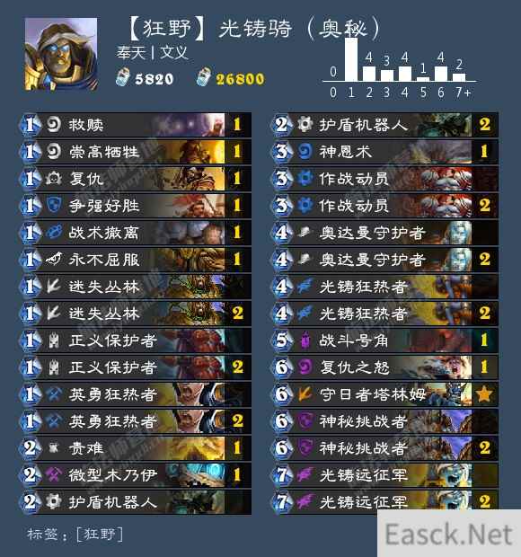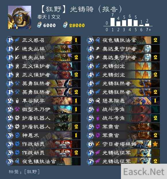 AAEBAZ3DAwyMAcgEpwWWCYwO2BSLvQK5wQL40gKd7AKOmgPFoQMJ6g/tD6YVyRa4xwLjywLIpAObrgOcrgMA 奉天丨文义的两套职业骑,目前在传说前2000徘徊。 报告体系的更偏向于打快攻,因为有迷失丛林和旱谷狱卒可以达到快速铺场,四费配合光铸剑龙,五费配合军需官是强势的一波站场。新的支线任务正义感召在前期是很强的一波buff,可以配合作战动员很快完成任务铺三个2-2报告。由于我们低费卡太多很容易断资源,光铸远征军不仅作为一个梦想牌,也可以补充中期的手牌资源。这套定位为偏中速的快攻卡组。 奥秘体系更偏向于打慢速卡组,节奏点在6、7费,6费下神秘挑战者,7费拍光铸远征军,对手解不掉就压责难。满编神秘挑战者为了增加6费前的上手率,而且佛祖也是中期的核心,对手会因为满头的奥秘在6费处理不掉佛祖而失去场面优势。值得一提的是442光铸狂热者给的刀在前期也可以抢回节奏,不管是解贼的暴徒,战士的海盗船长还是法师的露娜都是赚的。整体思路是前期依靠英勇狂热者蹭血和报告兵站场,中期利用奥秘打断对手节奏,在铺场中配合奥秘持续给对手压力,我们只要保持主动地位就可以把对手抢脸拿下。用奥秘体系的话,如果快攻比较多,可以加一张奉献,去掉争强好胜。 魔兽世界社区所有攻略资讯查询方法:1、想要寻找魔兽世界正式服和怀旧服最新攻略、资讯,可以下载安装魔兽世界社区。 2、首先点击下载魔兽世界社区,安卓下载地址:点击查看,IOS下载地址:点击查看,或者直接下载3dmapp,下载地址:点击查看。 3、下载安装app,然后点击app上方搜索关键词,会有相关下拉搜索,选择自己想要的魔兽世界攻略或者资讯,可以点击查看。