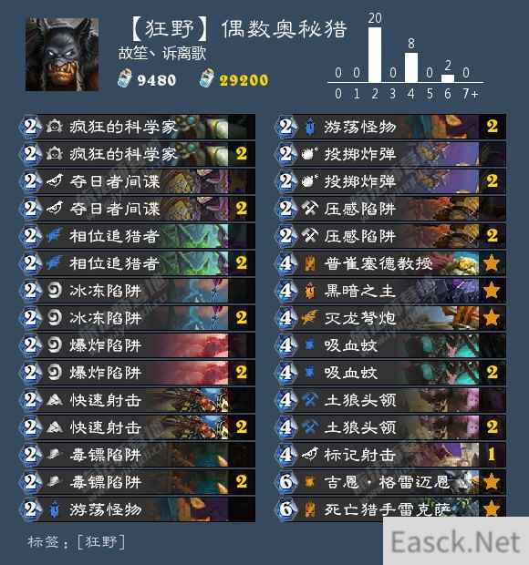 AAEBAR8Gw8wChtMC9uoCzfQC5pYDh7ADDIcEyQT3DdQRzRbf0gLv8QLg9QK+mAOfpQOipQP7rwMA 故笙丶诉离歌打上传说的一套偶数奥秘猎,在上分过程中打过12连胜的不错战绩。 这一套蛮新颖的构筑, 因为大量用来解小随从的牌,爆炸、游荡陷阱等牌让其在快攻内战并不吃亏,而在和慢牌对局时,牌库里有不少直伤,还压着DK这样的王牌,也有一战之力。 从两费曲线的20张就能看出整体节奏偏快,起手除了压感陷阱之外的奥秘都换掉——毕竟狂野模式手动一个个挂两费的奥秘看着就不可行,要全力去找6个优质两费生物,辅助压缩牌库+压场,尤其是相位追猎者,和1费的技能配合效率极高。 如果怕剽窃贼的吸血刀或者海盗战提刀乱砍,可以把标记射击换小软,黑暗之主在宇宙套牌少的 分段也可以酌情替换;祖尔金虽然能挂一头绿包,但费用过高容易卡手,遂于测试后放弃。 ——生而女装 | 记者