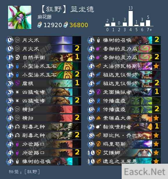 AAEBAaa4AwrpAbQDkwTWEekV7BXguwLo/ALWmQPanQMKQNMDig6gzQKY0gKe0gKE5gK/8gKM+wL2sAMA 来自国服玩家麻花藤的一套蓝龙德。这是他改进了几个版本的完善版,目前他用这套牌在传说3000名左右划水。 这套牌采用稳扎稳打的思路,放弃了滋养成长等跳费科技手段,前期苟活叠甲,解场,并找机会配合过牌凑组件。因为带了大量解牌和前期叠甲手段,对阵普遍快攻处于小优势,在对阵中速卡组和控制卡组时也有不俗的应对能力,在不被破坏组件的情况下后期配合蓝龙伤害可以满血斩杀。但是在对阵OTK卡组较劣势,因为一般正常牌序和过牌速度,大概进入十费后的一两个回合才可以启动,而普通OTK卡组追求极致过牌,可能会先我们启动。 这里说一些小细节,866乔巴斯抽大帝或者av娜都可以加快启动,另外可能抽到111的大法师,这时候也可以选择用744复制大法师和蓝龙,打个横扫,回合结束两个大法师复制两次横扫达到斩杀。另外需要注意的是744黏液喷射者优先复制的是左侧的随从,有几把对面脏鼠拉533无面,没送掉,导致随从位置不够,位置放错少复制一个蓝龙错斩了 ——雾都丨菜逼老猫