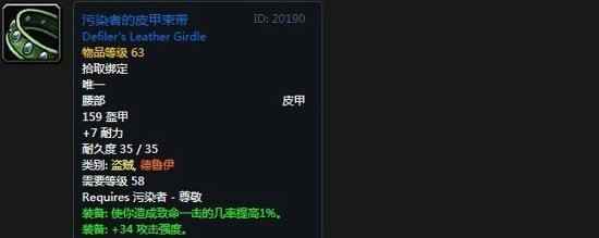 15、污染者的皮甲束带:蓝色品质皮甲腰带,159盔甲,+7耐力,装备效果使你造成致命一击的几率提高1%,装备效果+34攻击强度,污染者声望尊敬后兑换。 套装属性:2件套装:+5耐力,3件套装使你法术致命一击的几率提高1%。