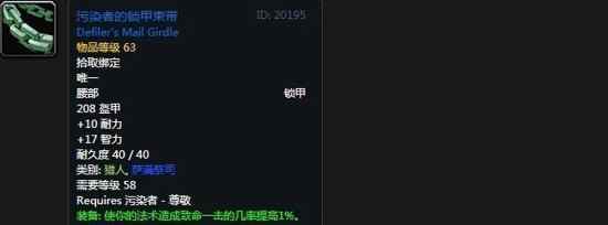 17、污染者的锁甲束带:蓝色品质锁甲腰带,208盔甲,+10耐力,+17智力,装备效果使你的法术造成致命一击的几率提高1%,污染者声望尊敬后兑换。 套装属性:2件套装:+5耐力,3件套装使你法术致命一击的几率提高1%。
