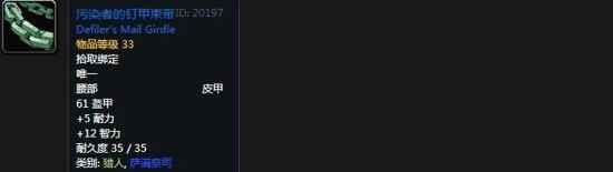 18、污染者的钉甲束带:蓝色品质皮甲腰带,61盔甲,+5耐力,+12智力,污染者声望尊敬后兑换。