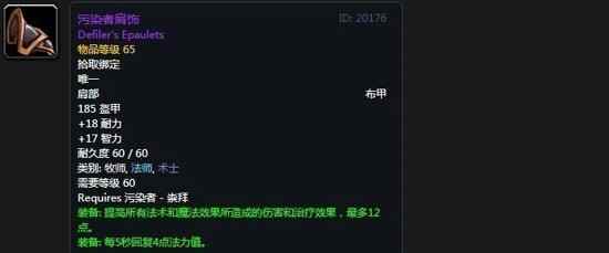13、污染者肩饰:紫色品质布甲肩甲,185盔甲,+18耐力,+17智力,装备效果提高所有法术和魔法效果所造成的伤害和治疗效果,最多12点,装备效果每5秒回复4点法力值,污染者声望崇拜后兑换。 套装属性:2件套装:+5耐力,3件套装使你法术致命一击的几率提高1%。