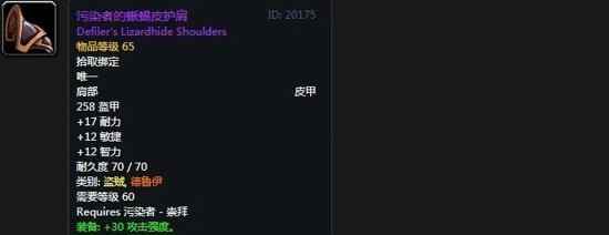 12、污染者的蜥蜴皮护肩:紫色品质皮甲肩甲,258盔甲,+17耐力,+12敏捷,+12智力,装备效果+30攻击强度,污染者声望崇拜后兑换。 套装属性:2件套装:+5耐力,3件套装使你法术致命一击的几率提高1%。