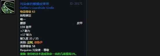 11、污染者的蜥蜴皮束带:蓝色品质皮甲腰带,159盔甲,+7耐力,+17智力,装备效果使你的法术造成致命一击的几率提高1%,污染者声望尊敬后兑换。 套装属性:2件套装:+5耐力,3件套装使你法术致命一击的几率提高1%。