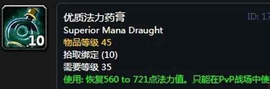 2、优质法力药膏:药剂,使用恢复560 to 721点法力值。只能在PvP战场中使用。