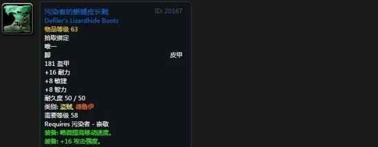 10、污染者的蜥蜴皮长靴:蓝色品质皮甲脚部,181盔甲,+16耐力,+8敏捷,+8智力,装备效果略微提高移动速度,装备效果+16攻击强度,污染者声望崇敬后兑换。 套装属性:2件套装:+5耐力,3件套装使你法术致命一击的几率提高1%。