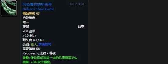5、污染者的链甲束带:蓝色品质锁甲腰带,208盔甲,+10耐力,装备效果使你造成致命一击的几率提高1%,装备效果+34攻击强度,污染者声望尊敬后兑换。 套装属性:2件套装:+5耐力,3件套装使你致命一击的几率提高1%。