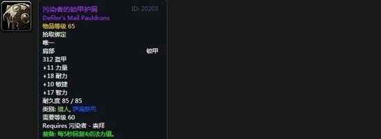 20、污染者的锁甲护肩:紫色品质锁甲肩甲,312盔甲,+11力量,+18耐力,+10敏捷,+17智力,装备效果每5秒回复4点法力值,污染者声望崇拜后兑换。 套装属性:2件套装:+5耐力,3件套装使你致命一击的几率提高1%。