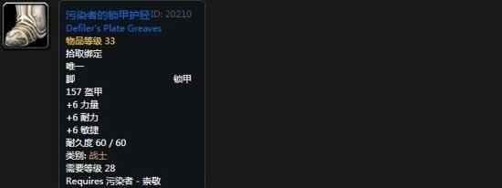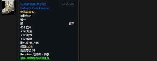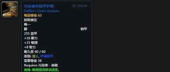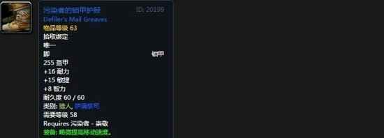 19、污染者的锁甲护胫:蓝色品质锁甲脚部,255盔甲,+16耐力,+15敏捷,+8智力,装备效果略微提高移动速度,污染者声望崇敬后兑换。