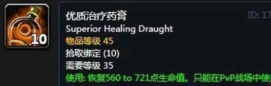 1、优质治疗药膏:药剂,使用恢复560 to 721点生命值。只能在PvP战场中使用。