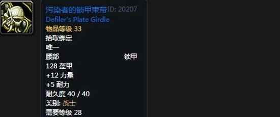 21、污染者的板甲束带:蓝色品质板甲腰带,369盔甲,+17力量,+10耐力,装备效果使你造成致命一击的几率提高1%,污染者声望尊敬后兑换。 套装属性:2件套装:+5耐力,3件套装使你致命一击的几率提高1%。