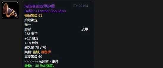 16、污染者的皮甲护肩:紫色品质皮甲肩部,258盔甲,+17耐力,+18敏捷,装备效果+30攻击强度,污染者声望崇拜后兑换。 套装属性:2件套装:+5耐力,3件套装使你法术致命一击的几率提高1%。