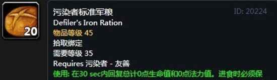 29、污染者野战军粮:食物,在30sec内回复总计0点生命值和0点法力值。进食时必须保持坐姿。只能在阿拉希盆地中使用,污染者声望友善后兑换。