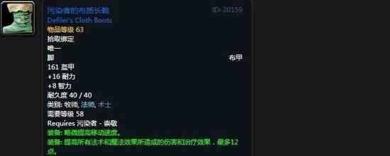 8、污染者的布质长靴:蓝色品质布甲脚部,161盔甲,+16耐力,+8智力,装备效果略微提高移动速度,装备效果提高所有法术和魔法效果所造成的伤害和治疗效果,最多12点,污染者声望崇敬后兑换。 套装属性:2件套装:+5耐力,3件套装使你法术致命一击的几率提高1%。