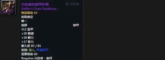 7、污染者的链甲护肩:紫色品质锁甲肩甲,312盔甲,+20敏捷,+18耐力,+17智力,污染者声望崇拜后兑换。 套装属性:2件套装:+5耐力,3件套装使你致命一击的几率提高1%。