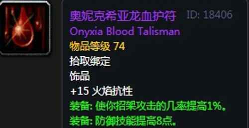 奥妮克希亚龙血护符:饰品2,出自黑龙公主任务线奖励; 基础属性:+15火焰抗性,装备效果 使你招架攻击的几率提高1%,防御技能提高8点,每5秒恢复7点生命值。 魔兽世界社区所有攻略资讯查询方法:1、想要寻找魔兽世界正式服和怀旧服最新攻略、资讯,可以下载安装魔兽世界社区。 2、首先点击下载魔兽世界社区,安卓下载地址:点击查看,IOS下载地址:点击查看,或者直接下载3dmapp,下载地址:点击查看。 3、下载安装app,然后点击app上方搜索关键词,会有相关下拉搜索,选择自己想要的魔兽世界攻略或者资讯,可以点击查看。