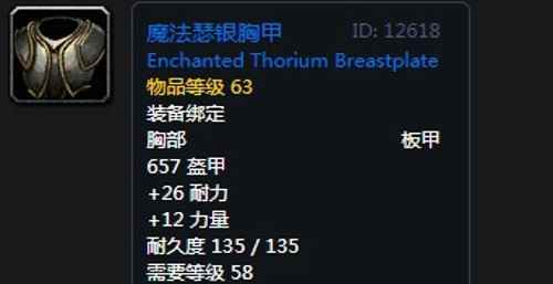 魔化瑟银胸甲:胸甲,出自锻造专业制作,推荐附魔防御+3. 基础属性:657护甲,+12力量,+26耐力,装备效果防御技能提高9点。