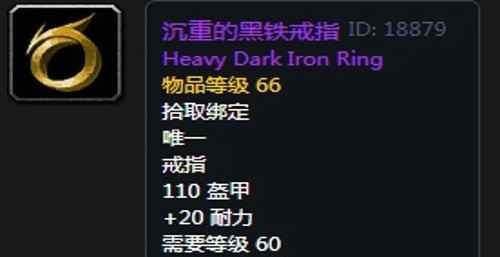 沉重的黑铁戒指:戒指2,出自熔火之心副本萨弗隆先驱者,鲁西弗隆,基赫纳斯,沙斯拉尔掉落; 基础属性:110护甲,+20耐力,装备效果防御技能提高5点。