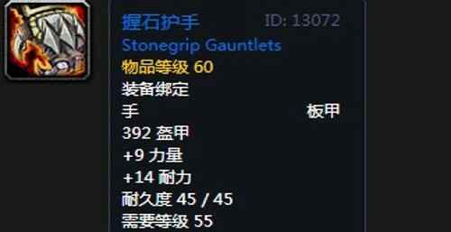 握石护手:手套,出自世界掉落,推荐附魔防御+3; 基础属性:392护甲,+9力量,+14耐力,装备效果防御技能提高10点。