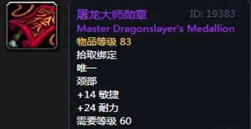 屠龙大师勋章:项链,出自黑翼之巢任务获取,无法附魔。 基础属性:+14敏捷,+24耐力,装备效果防御技能提高7点。