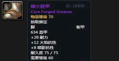熔火胫甲:脚部,出自熔火之心副本管理者埃克索图斯箱子掉落,推荐附魔防御+3; 基础属性:634护甲,+28耐力,+12火焰抗性,+8暗影抗性,装备效果防御技能提高4点。