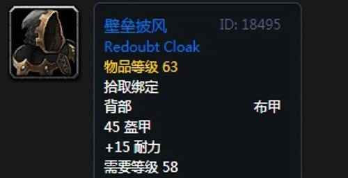 壁垒披风:披风,出自厄运之槌小怪掉落,推荐附魔超级防御; 基础属性:45护甲,+15耐力,装备效果防御技能提高7点。