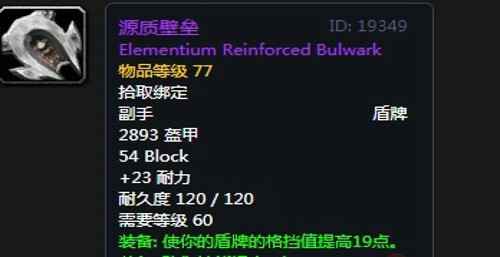 源质壁垒:盾牌,出自黑翼之巢副本克洛玛古斯掉落,推荐附魔强效耐力。 基础属性:289护甲,+54耐力,+2983,装备效果 使你的盾牌的格挡值提高19点,防御技能提高7点。