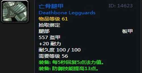 亡骨腿甲:腿部,出自通灵学院BOSS均有几率掉落,推荐附魔防御+3; 基础属性:557护甲,+20耐力,装备效果每5秒回复5点法力值,防御技能提高13点。