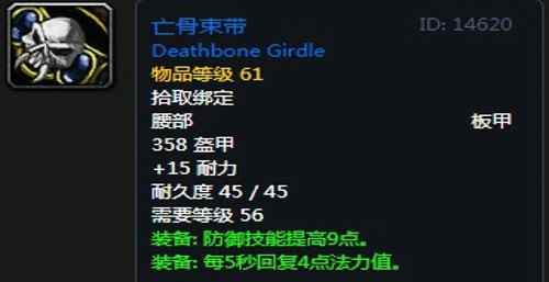 亡骨束带:腰带,出自通灵学院BOSS均有几率掉落,无法附魔; 基础属性:358护甲,+15耐力,装备效果防御技能提高9点,每5秒回复4点法力值。