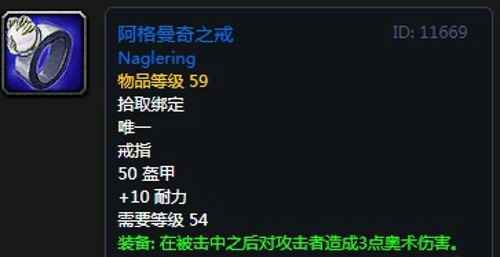 阿格曼奇之戒:戒指1,出自黑石深渊副本傀儡统帅阿格曼奇掉落。 基础属性:50护甲,+10耐力,装备效果在被击中之后对攻击者造成3点奥术伤害,防御技能提高5点。
