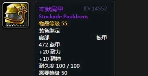牢狱肩甲:肩甲,出自世界掉落,推荐附魔多彩黎明衬肩; 基础属性:472护甲,+20耐力,+10精神,装备效果防御技能提高10点。