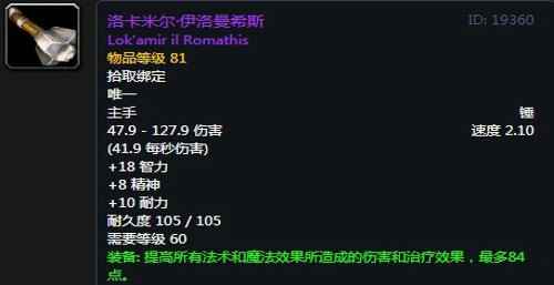 洛卡米尔伊洛曼希斯,单手权杖,出自黑翼之巢副本奈法利安掉落,推荐附魔治疗能量。 基础属性:48-128伤害,攻速2.10,+18智力,+10耐力,+8精神,装备效果提高所有法术和魔法效果所造成的伤害和治疗效果,最多84点。