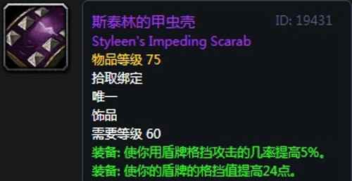 斯泰林的甲虫壳:饰品1,出自黑翼之巢副本弗莱格尔掉落,无法附魔。 基础属性:无基础属性,使你用盾牌格挡攻击的几率提高5%,使你的盾牌的格挡值提高24点,防御技能提高13点。
