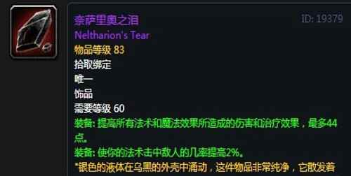 奈萨里奥之泪:饰品1,出自黑翼之巢副本奈法利安掉落,无法附魔。 基础属性:无基础属性,装备效果提高所有法术和魔法效果所造成的伤害和治疗效果,最多44点,使你的法术击中敌人的几率提高2%。