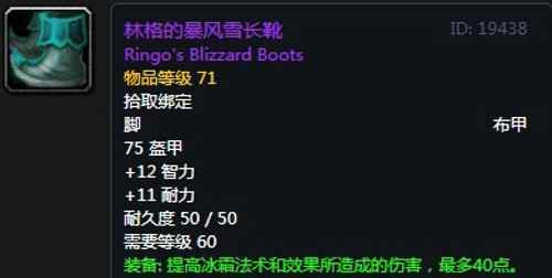 林格的暴风雪长靴:脚部,出自黑翼之巢副本黑翼龙人护卫掉落,推荐附魔初级速度。 基础属性:75护甲,+12智力,+11耐力,装备效果提高冰霜法术和效果所造成的伤害,最多40点,使你的法术击中敌人的几率提高1%。